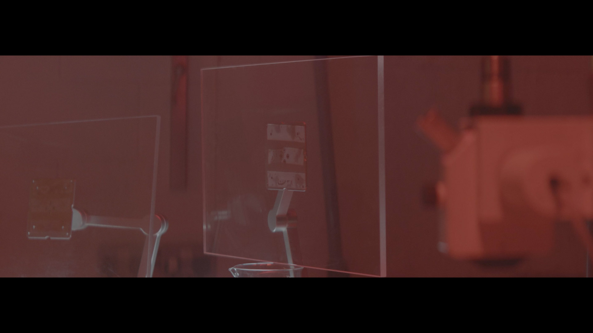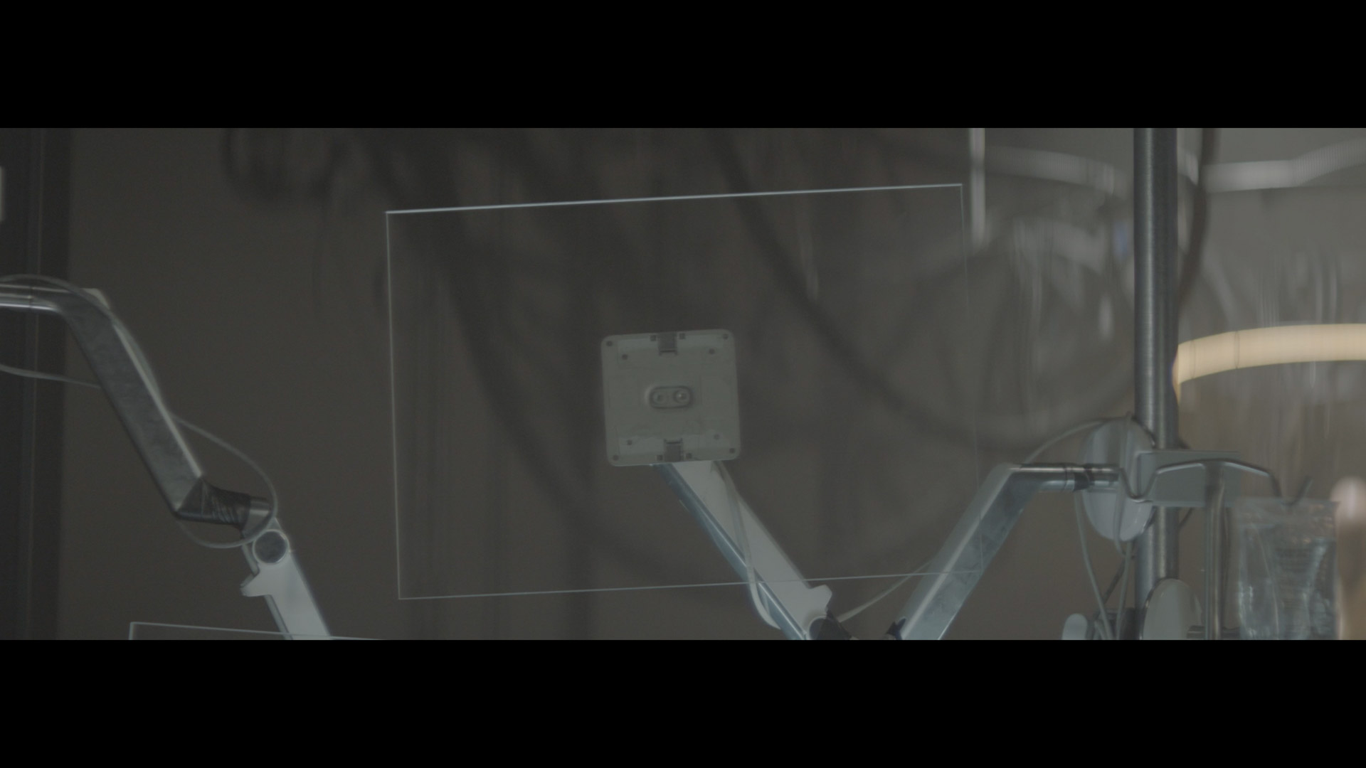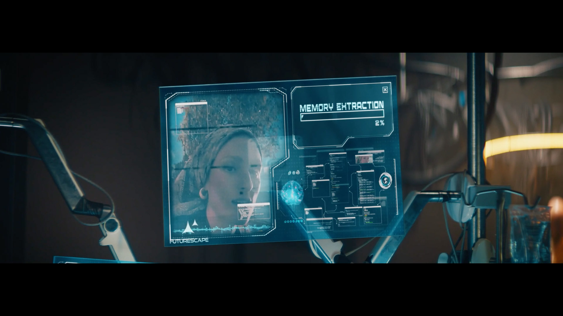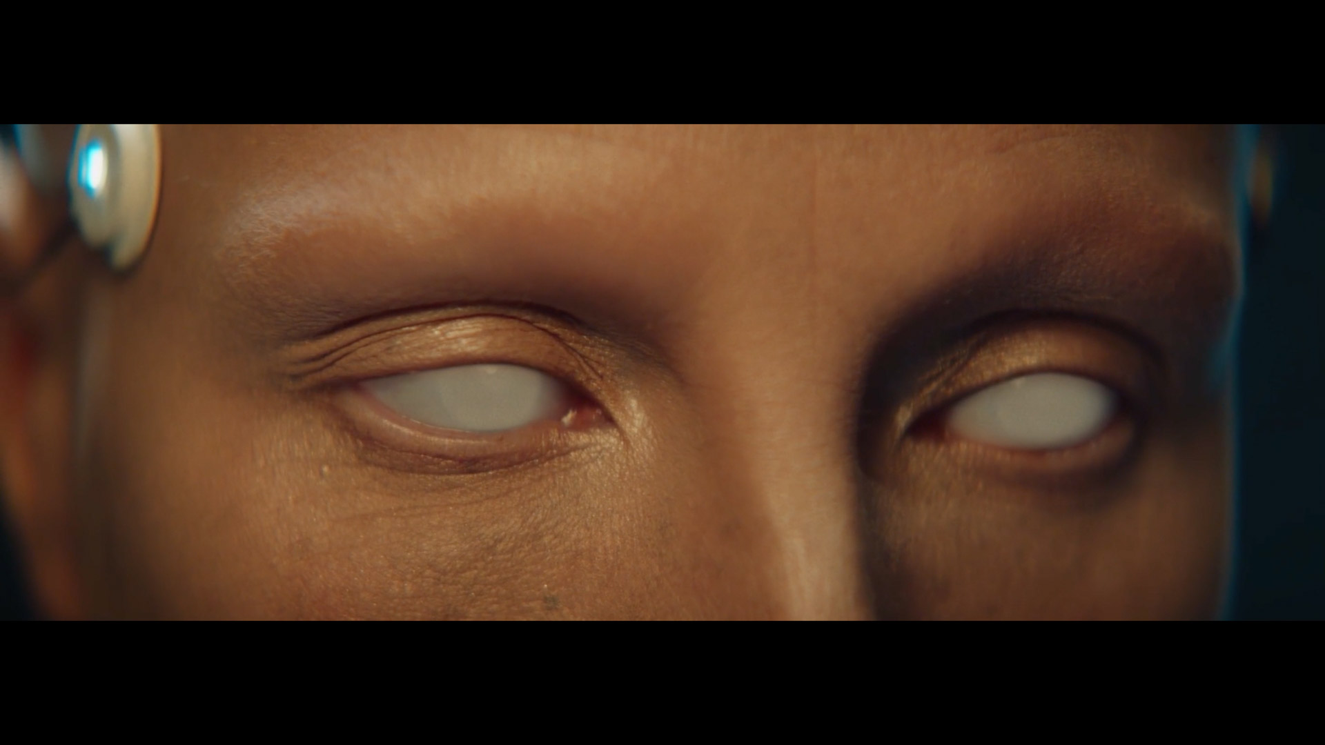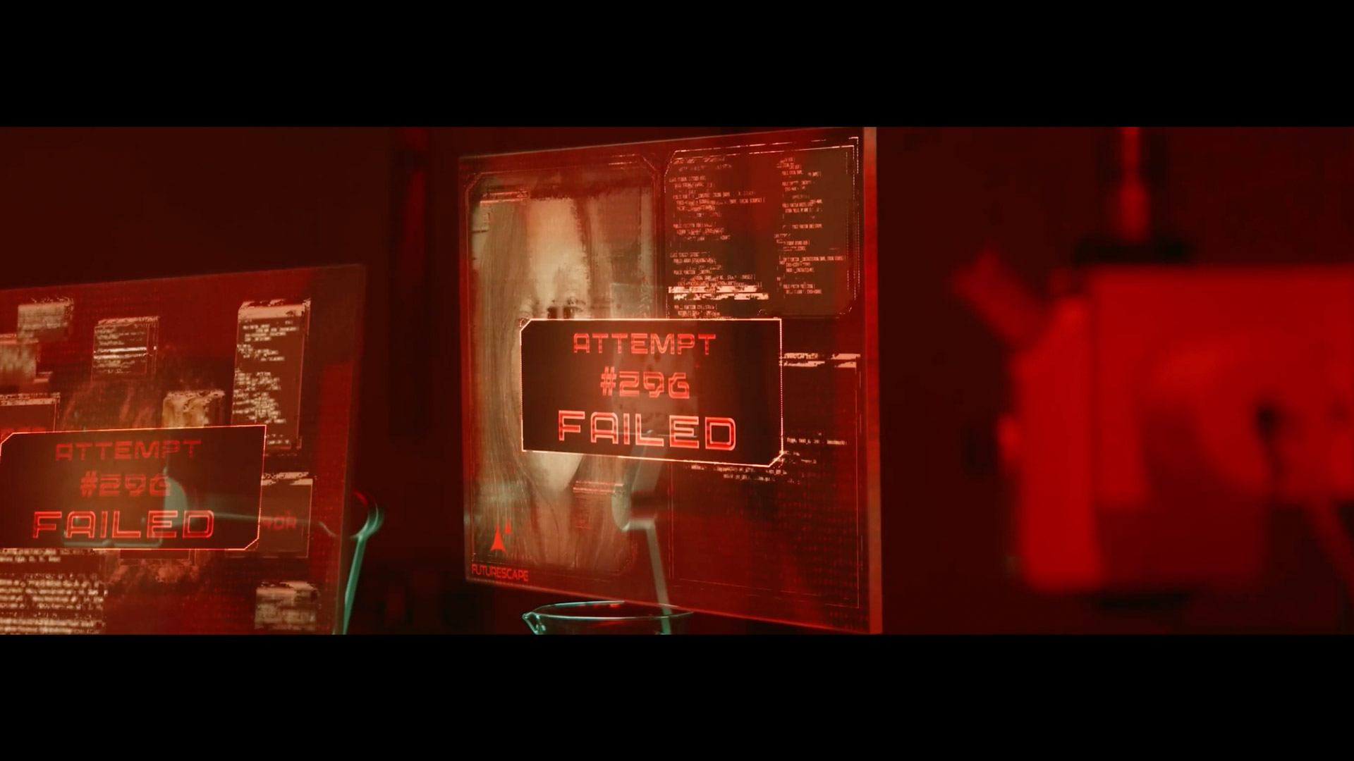 Multi-screen displays, glitch transitions, and an organic artificial eye membrane were composited into the footage to establish a controlled sci-fi environment across the footage.